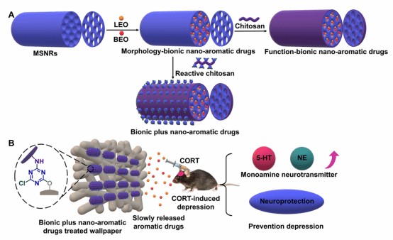 近日,公司威廉希尔williamhill官网刘瑞瑗博士作为第一作者(威廉希尔足球官网第一单位)和中国科学院过程工程研究所卢治国副研究员合作在Journal of Nanobiotechnology杂志(TOP期刊,SCI分区1区,影响因子10.6)上发表题为“Microbial bionic nano-aromatic drugs for prevention of depression induced by chronic stress”的研究论文。该研究采用芳香疗法,受壁纸易发霉的启发,模仿微生物的棒状形貌和多糖类菌外分泌物,制备了仿生纳米芳香药物,提高在壁纸上的粘附性,并通过分子动力学模拟探讨了其分子机理。精油从仿生纳米芳香药物中持续缓慢地释放,增加慢性应激环境下小鼠脑内单胺类神经递质如血清素和去甲肾上腺素的分泌,具有良好的神经保护作用,从而调节小鼠的情绪,预防抑郁症,具有巨大的应用前景。
