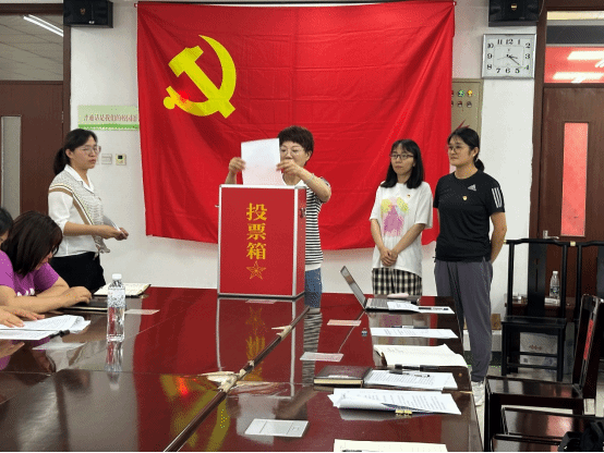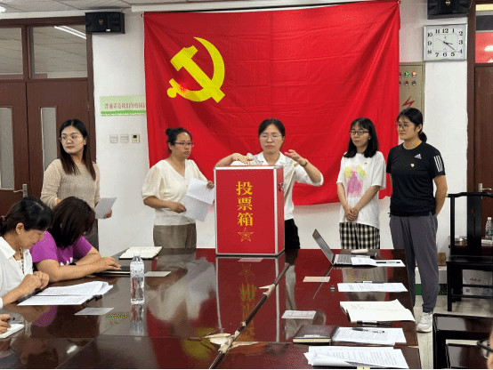 随后,会议进入支部委员换届选举议程。尹秀娟宣读了党支部选举办法,介绍了新一届支部委员会委员候选人建议名单及其详细信息。通过表决,全体党员一致通过了选举办法和候选人名单。大会按照选举办法和规定程序,进行无记名投票,最终差额选举出李秀芳、侯少阳,赵秀娟、王静涵、郑伟为新一届支部委员会委员。